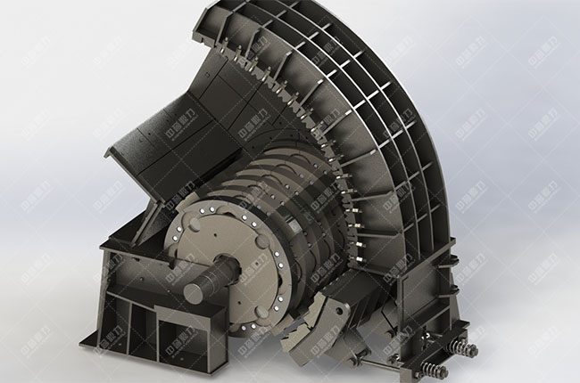 錘式破碎機一般采用上下機殼拼接的結(jié)構(gòu),除了機殼以外,錘式破碎機套配件還包括轉(zhuǎn)子、襯板、反擊板、調(diào)節(jié)襯板出料口等。轉(zhuǎn)子作為部件,主要由錘頭、錘架圓盤、主軸、