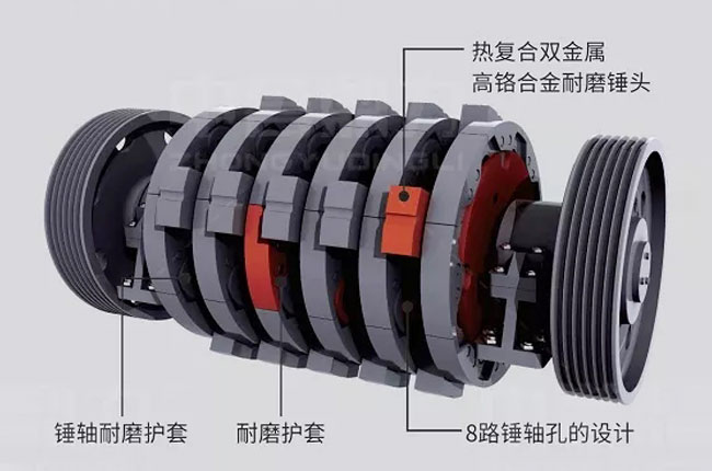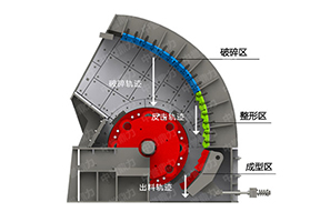 當(dāng)物料進(jìn)入破碎腔后,電機(jī)帶動(dòng)轉(zhuǎn)子旋轉(zhuǎn),轉(zhuǎn)子帶動(dòng)錘頭將物料打到反擊板上進(jìn)行破碎,過(guò)后在進(jìn)行反拋進(jìn)行再次破碎,重復(fù)以上過(guò)程,物料會(huì)由大到小,等破碎到合適粒度,就會(huì)從排料口出來(lái),而且出料粒度可以根據(jù)自己的要求調(diào)整大小。