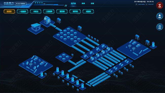 3、砂石骨料生產(chǎn)設備自動化控制系統(tǒng)即礦山生產(chǎn)管理系統(tǒng),提供人機交互界面,可對粉碎設備各組合體系做出啟停、聯(lián)動參數(shù)以及守護、報警參數(shù)的設置,提供設備故障報警實時查詢。