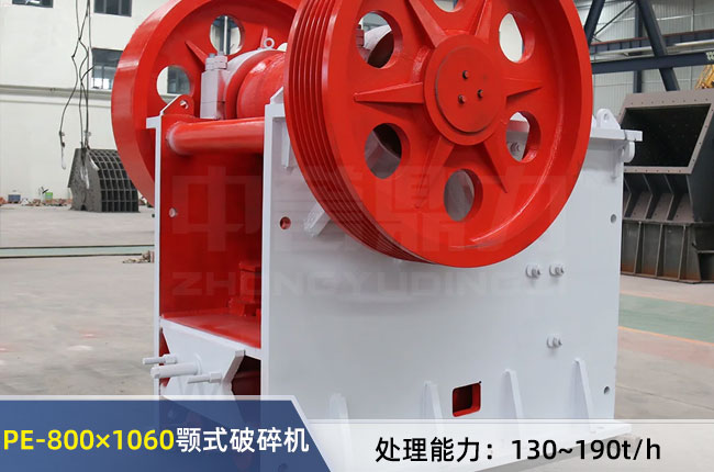 PE-800×1060顎式破碎機以進料口800×1060mm命名,較大進料粒度≤640mm,時處理能力在130-190噸,出料可調(diào)范圍在130-190mm,配備的8級110kw的電機,設(shè)備總重量是29.8噸。