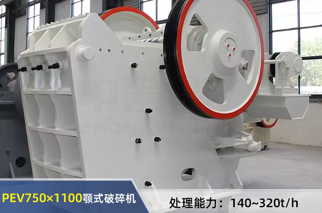750×1100破碎機指PEV750×1100顎式破碎機,進料口允許通過不大于640mm的物料,排料口調整范圍在80-190mm之間,一小時產(chǎn)量可達到140-320噸,所配置的電機功率為90-110千瓦,外形尺寸長寬高分別是3750mm,2580mm,3180mm,重量約26噸左右。
