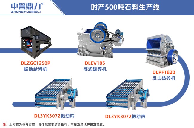 顎式破碎機(jī)作為粗破進(jìn)行喂料的一次破碎,物料可以達(dá)到65-250mm,再由輸送機(jī)輸送到反擊破進(jìn)行二次破碎(細(xì)碎),達(dá)到1-30mm左右,輸送到振動篩上根據(jù)需求進(jìn)行篩分,成品料生產(chǎn)完成,這條時產(chǎn)500噸生產(chǎn)線設(shè)備配置適用于所有軟巖物料的破碎。