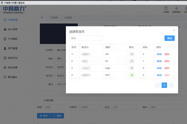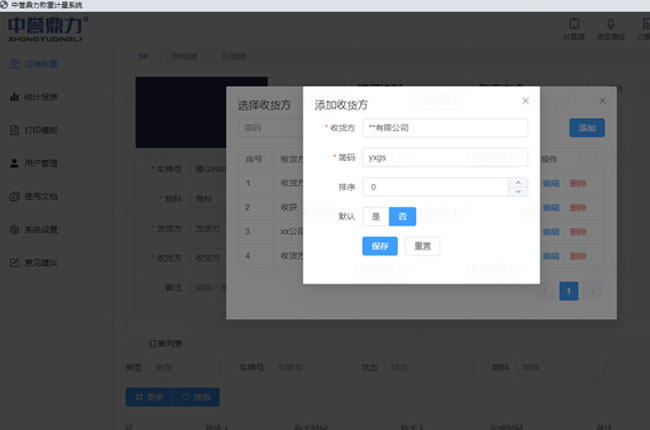 過磅稱重系統(tǒng)添加收貨單位,在收貨方文本欄雙擊,即可更換或新增收貨方,簡碼默認為收貨方拼音首字母簡拼,自動生成,個根據(jù)需求設置排序方式,支持默認項設置,操作更便捷。
