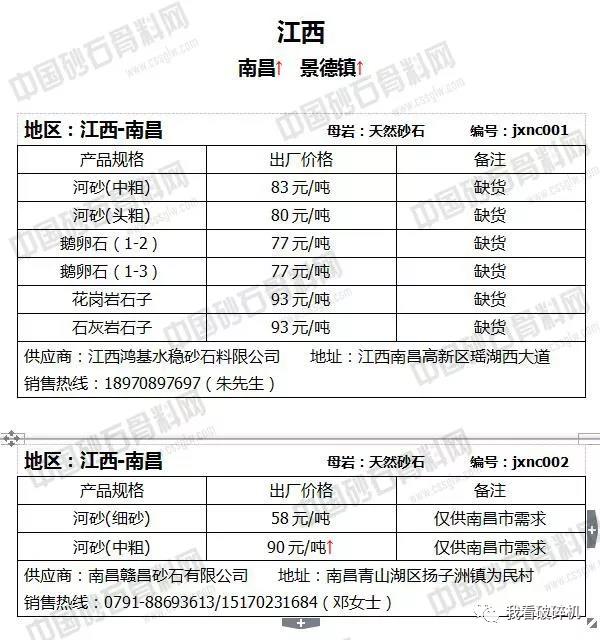 江西地區(qū):南昌中粗河砂價(jià)格上調(diào)30元/噸,景德鎮(zhèn)砂石價(jià)格上調(diào)幅度在2-6元/噸。