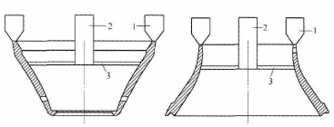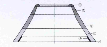 (1)模樣制作工藝CH660單缸圓錐破碎機(jī)動(dòng)錐、定錐襯板采用消失模分部制作粘合整體手工修正模樣制作完成。須工序合理,定位選擇準(zhǔn)確,模樣垂直度和同軸度要求。動(dòng)錐襯板:按圖1所示工藝制作模樣,在圓周方向六等分,高度方向分5部分進(jìn)行樣板放樣,分部制作模樣;以A 面為基準(zhǔn),逐步粘合①~⑤部分,校準(zhǔn)各部分模樣同軸度;按工藝圖要求進(jìn)行整體手工修整,模樣準(zhǔn)確與完整。定錐襯板:按圖2所示工藝制作模樣,在圓周方向六等分,高度方向分三部分進(jìn)行樣板放樣,制作模樣;以B 面及內(nèi)外徑為基準(zhǔn),先對(duì)①、②、③主體部分粘合校正,再粘合法蘭④,整體校正后,后分度粘合12個(gè)定位銷⑤。按工藝圖要求進(jìn)行整體手工修模。