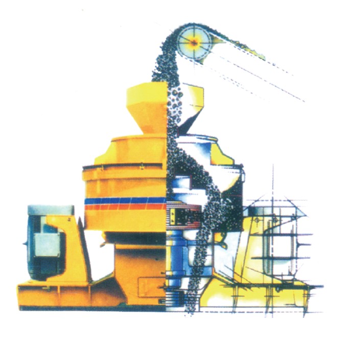 砂石物料由機(jī)器上部垂直落入高速旋轉(zhuǎn)的葉輪內(nèi),在高速離心力的作用下,與另一部分 以傘狀形式分流在葉輪四周的物料產(chǎn)生高速撞擊與粉碎,物料在互相撞擊后,又會(huì)在葉輪和機(jī)殼之間以物料形成渦流多次的互相撞擊、摩擦而粉碎,從下部直通排出,形成閉路多次循環(huán),由篩分設(shè)備控制達(dá)到所要求的成品粒度。