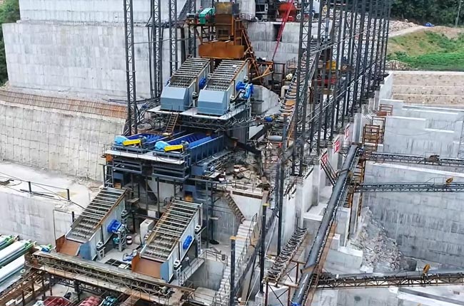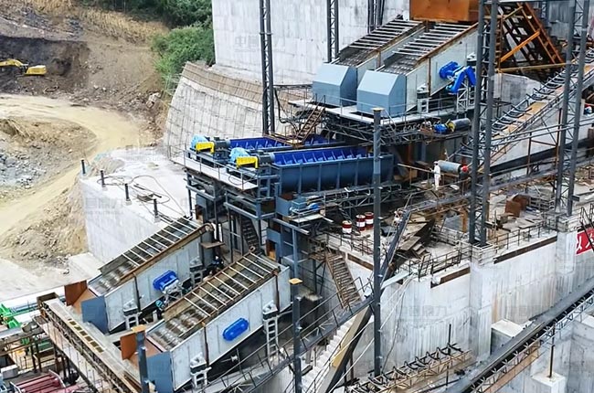 夢(mèng)皓礦業(yè)時(shí)產(chǎn)2000噸生產(chǎn)線由兩條時(shí)產(chǎn)1000噸的砂石骨料生產(chǎn)線組成,采用干濕結(jié)合的工藝。該生產(chǎn)線利用場(chǎng)地地形落差進(jìn)行建設(shè),巧妙地對(duì)于含泥量較高的原料,采用水洗骨料生產(chǎn)線進(jìn)行處理,該生產(chǎn)線使用了水洗線采用已使用近10年的1620重錘破及整套配設(shè)備,新建骨料生產(chǎn)線配備了1815重錘式破碎機(jī)、1622二破和3080稀油振動(dòng)篩等設(shè)備,可產(chǎn)出246碎石、瓜子片、水洗砂、58子等8種不同規(guī)格的骨料產(chǎn)品。