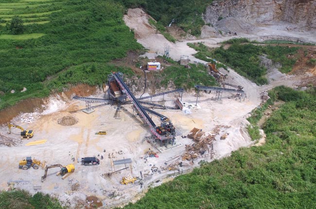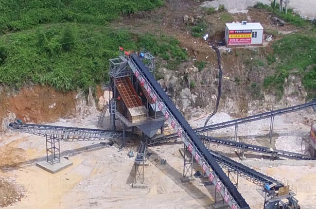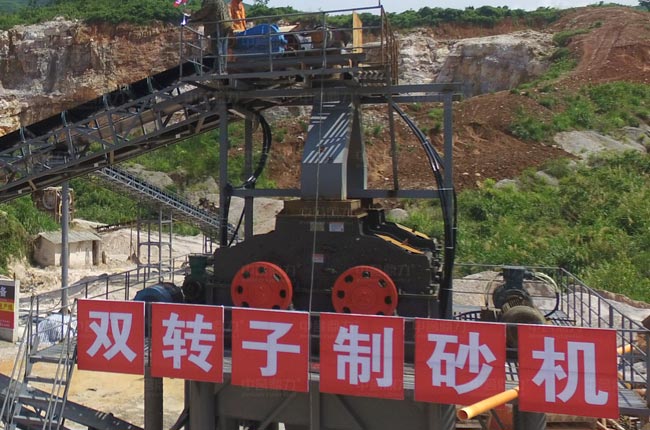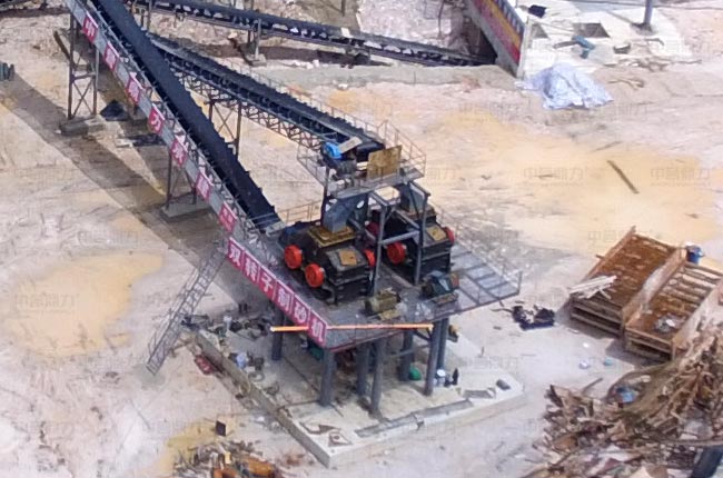 湖南抗應(yīng)洞采石場(chǎng)時(shí)產(chǎn)300噸機(jī)制砂生產(chǎn)線采用500*750顎破機(jī)對(duì)物料進(jìn)行粗碎,通過皮帶機(jī)送至中轉(zhuǎn)料堆,其后再通過皮帶機(jī)將碎石料送至兩臺(tái)ZSJ1213雙轉(zhuǎn)子制砂機(jī)細(xì)碎制砂,然后通過兩臺(tái)3YKZ2470振動(dòng)篩篩分,頭層篩網(wǎng)石料會(huì)通過皮帶機(jī)送至中轉(zhuǎn)料堆再次通過制砂機(jī)加工,其余石料根據(jù)成品皮帶機(jī)送至相應(yīng)的成品料堆。