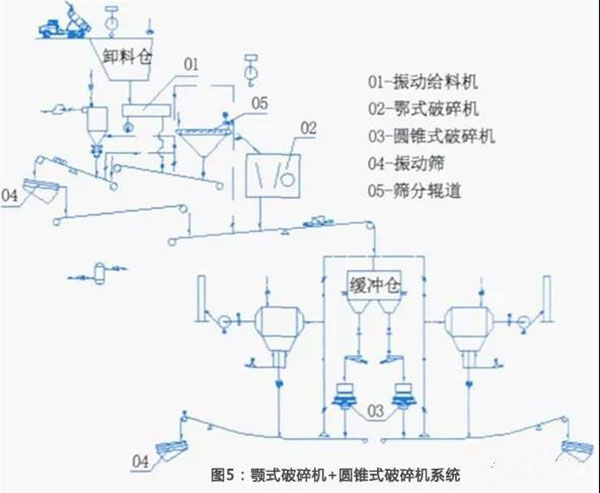由顎式破碎機(jī)、圓錐式破碎機(jī)和篩分系統(tǒng)組成,見圖5。