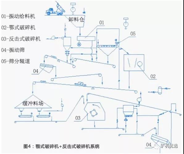由顎式破碎機(jī)、反擊式破碎機(jī)和篩分系統(tǒng)組成,見圖4。