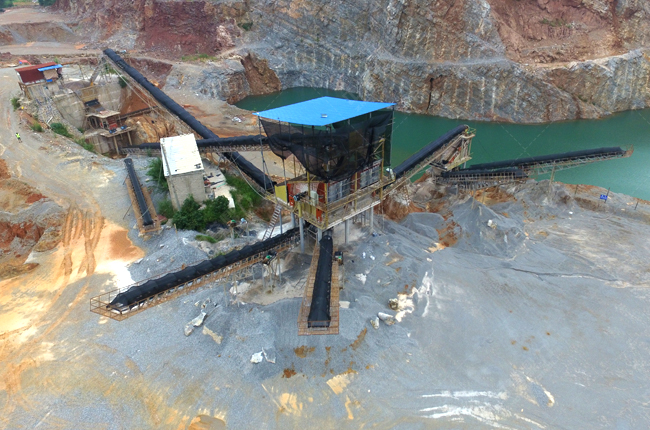 機械搭配:喂料機+顎式碎石機+反擊式破石機+震動篩+傳送機;