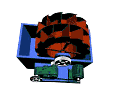 作業(yè)時(shí),動(dòng)力體系經(jīng)過V型皮帶、減速機(jī)、齒輪減速后葉輪緩慢轉(zhuǎn)動(dòng),砂石由喂料槽進(jìn)入洗槽中,在葉輪的下翻滾,并互相研磨,除去遍及砂石表觀的異物,此時(shí)破損包覆砂粒的水汽層,以利于脫水;此時(shí)加水,造成強(qiáng)悍水流,立刻將異物及比重小的異物沖走,并從溢出口洗槽排出,達(dá)成清洗步驟。