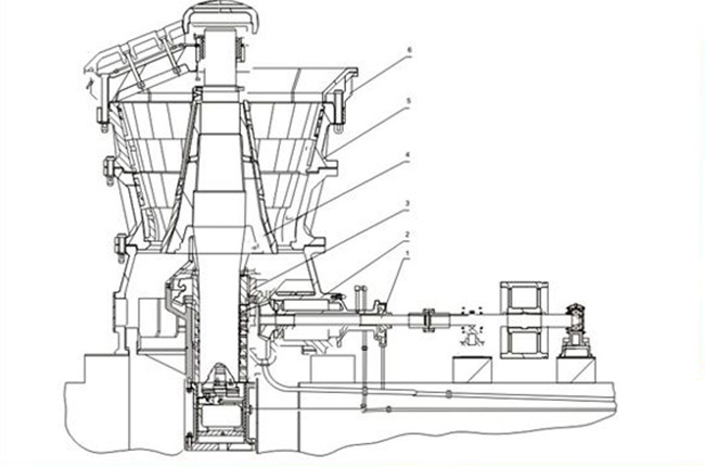旋回式破碎機(jī)主要以機(jī)座、偏心套、轉(zhuǎn)動(dòng)、破碎圓錐、中架體、橫梁、油缸等部件組成。