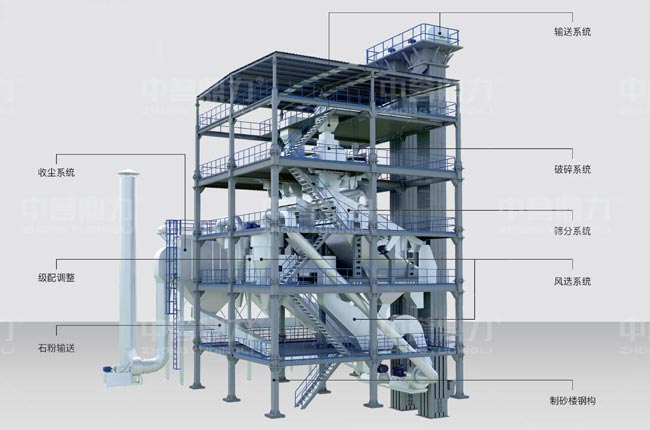 制砂樓(塔樓式制砂樓)采用干式制砂工藝,通過鋼結(jié)構(gòu)疊放設(shè)計,將制砂、篩分、選粉等系統(tǒng)集中于立體空間內(nèi),具有占地較小、綠色環(huán)保、級配可控、智能操縱等優(yōu)勢。