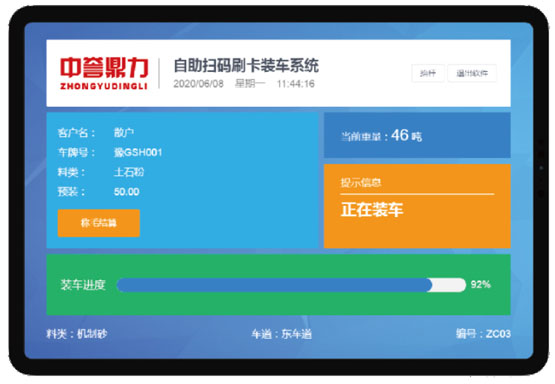 車輛稱毛重結(jié)束后,會(huì)開始砂石骨料的自動(dòng)裝車環(huán)節(jié),砂石料裝車系統(tǒng)語音提示”開始自動(dòng)裝車,裝載物料規(guī)格為XX”,裝車系統(tǒng)會(huì)將散裝頭根據(jù)車輛高度自動(dòng)調(diào)節(jié)至合適高度,便開始自動(dòng)卸料裝車。裝車結(jié)束后系統(tǒng)語音提示“裝車完成“,散裝頭會(huì)自動(dòng)上升至設(shè)定位置。此環(huán)節(jié)裝載重量會(huì)通過顯示屏在司機(jī)可視范圍內(nèi)實(shí)時(shí)顯示,并且也會(huì)有監(jiān)控系統(tǒng)抓拍留證。